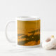 An imaginary and original 3d rendering of a landscape on the surface of Titan the largest moon of Saturn. Showing the attractive hazy amber landscape and seas of liquid methane. Possibly not an ideal vacation/holiday destination but in terms of kudos would beat anything on Earth. The text on the mug says "A Present from Titan"