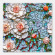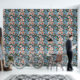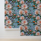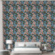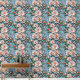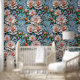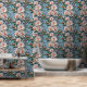 Pretty stick and pell wallpaper with a stunning blue and pink faux mosaic floral pattern, featuring vibrant coral-coloured flowers intertwined with sage green foliage. The intricate design mimics the look of stained glass and ceramic tiles, creating an elegant and timeless aesthetic.