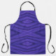 "A purple apron with a geometric diamond pattern is displayed. The top image shows the apron laid flat, while the bottom image shows a person wearing it, evoking a cheerful, modern tone."