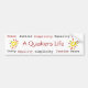 A Quakers Life printed across the front with two watercolor suns on each side. Across the top and bottom says peace, justice, simplicity, equality, and unity