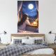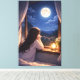 This serene illustration captures a quiet, introspective moment as a young girl gazes out of her window at the luminous full moon. The soft glow of moonlight fills the night sky, casting a calming blue hue over the distant hills and the warmly lit village below, creating a beautiful contrast between solitude and life.