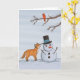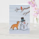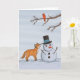 A cardinal perched on a tree branch watches on as a fox investigates a snowman left behind by some children on a cold winter morning.