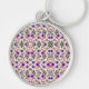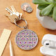 A round keychain features a detailed floral pattern with purple and pink flowers on a pale background. It lies beside a notebook and a phone on a wooden surface.