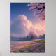 A vast field of delicate pink flowers, with blades of grass poking up between them, spreads out as far as the eye can see. In the midst of the field, a solitary sakura tree stands tall, its delicate petals fluttering in the gentle breeze. The sky overhead is clear blue, but in the distance, dark clouds begin to gather, hinting at a coming storm.