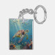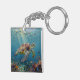 A sea turtle themed Keychain with an illustration of a sea turtle under a calm teal sea swimming among the coral on the ocean floor with sun rays beaming down on him through the aqua water. Add a coastal feeling to your beach home.