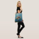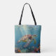 A sea turtle themed personalized tote bag with an illustration of a sea turtle under a calm teal sea swimming among the coral on the ocean floor with sun rays beaming down on him through the aqua water.