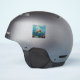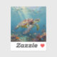 A sea turtle themed sticker with an illustration of a sea turtle under a calm teal sea swimming among the coral on the ocean floor with sun rays beaming down on him through the aqua water.
