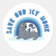 A Frisbee featuring a cute illustration of a happy cheerful penguin sitting atop of a seal, with a blue rainbow and a text saying "Save Our Icy World" over them. This is a perfect present for people who care about our wonderful nature and beautiful planet.