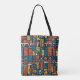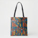A seamless abstract pattern with various geometric shapes and tribal-inspired motifs in shades of orange, blue, and black tote bag