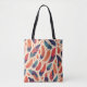 A seamless pattern of colourful feathers in shades of orange, red, and blue on a light background tote bag