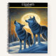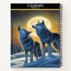 Two majestic wolves gracefully howl towards a radiant full moon illuminating the serene winter landscape