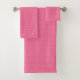 A set of pink gingham-patterned bath linens hangs on a silver bar; includes a towel, hand towel, and face cloth, exuding a fresh and vibrant tone.