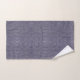 A set of purple towels with a diamond pattern hangs on a metal rod. Below, one towel is laid flat with a folded corner revealing a white underside.
