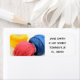 Brightly coloured balls of embrodery and sewing thread on a clear and easy to read return address label.