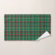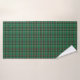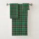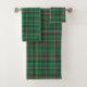 A set of three green plaid towels with red, yellow, and white stripes hang neatly on a silver rod against a white wall, evoking a festive and cozy vibe.