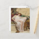 This postcard features artwork by John William Godward: "A Siesta" (1895). It depicts a sleeping young woman wearing a diaphanous gown, sprawled on a luxurious arrangement of furs, with a marble background. Relaxation, luxury, sensuality in Godward's classic realistic, highly detailed style.