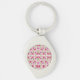 A silver teardrop keychain with a round pink