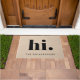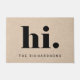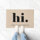 This whimsical and super stylish doormat says simply "hi." in bold, modern black text on a soft beige kraft look background, with a spot for your name.