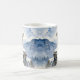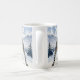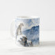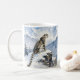 A pretty wildlife coffee mug with an illustration of a majestic snow leopard perched on a craggy, snow-covered peak, gazing out at a vast, frozen mountain range.