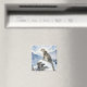 A pretty wildlife magnet with an illustration of a majestic snow leopard perched on a craggy, snow-covered peak, gazing out at a vast, frozen mountain range.