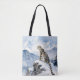A pretty wildlife tote bag with an illustration of a majestic snow leopard perched on a craggy, snow-covered peak, gazing out at a vast, frozen mountain range.