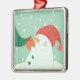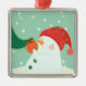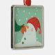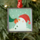 A snowman hanging an ornament on a tree