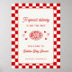 A Special Delivery Baby Shower Welcome Sign: italian-themed and checkered red and white for this cute baby shower sign. This retro design is perfect for a pizza themed party and a fun celebration.