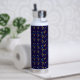 A stainless steel tumbler with a vibrant, multicolored geometric pattern on a dark blue wrap. It features a secure black lid and sturdy handle.