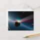 Artist's conception of a storm of comets in the Eta Corvi system, with a possible planet. One such giant comet is shown smashing into a rocky planet, flinging ice- and carbon-rich dust into space, while also smashing water and organics into the surface of the planet. A glowing red flash captures the moment of impact on the planet. Yellow-white Eta Corvi is shown to the left, with still more comets streaming towards it.