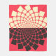 A stylised flower emerging from water, or a rising sun on the horizon, in a black, red, and ivory colour palette.