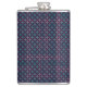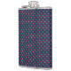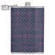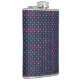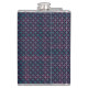 A stylish flask with a geometric pattern of small, repeating red, blue, and white dots on a dark background, conveying a modern and vibrant tone.