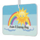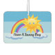 Cute picture of a smiling sun, with rainbow and clouds, is featured on both the front and back of this auto air freshener. With message, "Have A Sunny Day", this colourful air freshener is sure to brighten your day! Available in three different scents too.