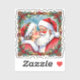 A Christmas sticker with vintage vibes to bring back those nostalgic feelings of Christmas long ago. A watercolor illustration of Mr and Mrs Claus kissing under the mistletoe. Pine cones, berries, and sparkling Christmas lights frame them. Add a vintage feel to your Christmas cards sealing them with these cute stickers.