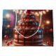 A decadent three-tiered chocolate cake takes centre stage, its rich layers adorned with cascading chocolate ganache and a vibrant scattering of colourful sprinkles. Each tier is crowned with plump, juicy cherries, and a single, perfect cherry reigns supreme at the very top. The warm, inviting glow of fairy lights in the background creates a festive atmosphere, hinting at a joyous celebration. The scene is a feast for the eyes, promising a delightful explosion of flavour with every bite.