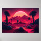 In "A Synthwave World Beyond Our Own," the viewer is transported to an otherworldly landscape bathed in the warm glow of a crimson sunset. Towering mountains loom in the distance, their jagged peaks silhouetted against the fiery sky. In the foreground, a row of palm trees sway gently in the breeze, their fronds illuminated by the vibrant hues of the horizon. The scene is suffused with a sense of otherness, as though the world depicted exists in a parallel universe or alternate dimension. The entire landscape seems to pulse with an electric energy, as though it's alive with the sound of synthesized music and the hum of neon lights. It's a place that feels both familiar and completely foreign, a glimpse into a world that exists beyond our own.