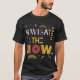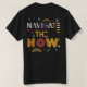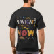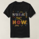 A t-shirt design with the text "Navigate the Now." in bold, geometric letters, set against a backdrop of colourful shapes and lines.