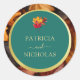 Add a touch of autumnal enchantment to your wedding with our exquisite round stickers. These charming stickers feature a rustic backdrop of autumn leaves, adorned with a shorter, teal panel framed by a shimmering gold border and surrounded by autumn foliage. The couple's names are elegantly displayed within the frame, creating a personalised and memorable keepsake.