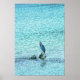 A minimalism photograph of a Heron perched on a tree that has not fully submerged under the water. The surface of the water is disturbed by the wind and ripples create a blue textured backdrop.