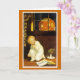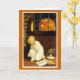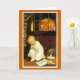 Vintage Halloween greeting card illustration showing a child "spooked" by a jack o'lantern at the window.