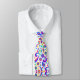 A tie with a vibrant, colorful paisley pattern in purple, red, green, and blue against a white background, shown both front and back on a plain white surface.