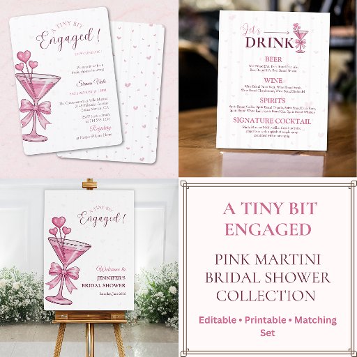 Celebrate the newly engaged couple in style with this A Tiny Bit Engaged engagement party invitation, featuring a chic pink martini glass illustration and a soft romantic design. Perfect for cocktail-themed engagement parties, this modern and feminine invitation sets the tone for a fun and stylish celebration.