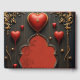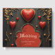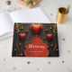 A touch of gothic, hearts and eternal connection. The design features a dark, elegant background design that immediately draws attention. Several bright red hearts, some seemingly turned into teardrops, hang from delicate, thin strings, lending the card a playful and romantic touch. The centre is dominated by an artfully designed frame with a red interior, decorated with a delicate rose pattern symbolising love and passion. At the bottom, lush bouquets of red roses with lush greenery adorn the card, underscoring the romantic atmosphere.