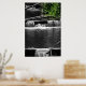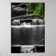 Black and white photo of a small river and waterfall features a touch of green in the leaves hanging above.