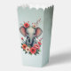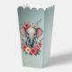 A touch of summer: The baby elephant in a sea of flowers. This enchanting design features a loving illustration of a small baby elephant, painted in delicate shades of grey. Its pink inner ears add a playful and charming touch. Its large, expressive eyes radiate curiosity and friendliness, while its sweet facial expression conveys pure warmth. The elephant sits gently enthroned among a variety of colourful flowers in vibrant shades of red, orange, pink, and white.
