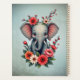A touch of summer: The baby elephant in a sea of flowers. This enchanting design features a loving illustration of a small baby elephant, painted in delicate shades of grey. Its pink inner ears add a playful and charming touch. Its large, expressive eyes radiate curiosity and friendliness, while its sweet facial expression conveys pure warmth. The elephant sits gently enthroned among a variety of colourful flowers in vibrant shades of red, orange, pink, and white.
