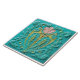 A square tile with a raised floral design in shades of blue, yellow, pink, and gold. The background is a solid turquoise blue. The central design features two large, stylised leaves in a teal colour with gold accents, flanking a pink flower with a gold centre. The leaves are set against a yellow shield-shaped backdrop.