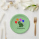 A 7", Round, Light Green, Colour, Paper Plate, with a Drawing of a Turtle and Balloons, (Art by P.J.M.) in the middle of it, With Black, Colour Text, that says " It's My Birthday!" on it.