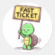 a turtle holding an ironic sing that is funny and says : "fast ticket"