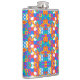A vibrant flask featuring a colorful geometric pattern with shapes like flowers and squares in red, blue, yellow, and green, creating a lively and playful design.