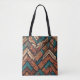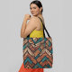 A vibrant and intricate pattern featuring overlapping geometric shapes and feather-like designs in shades of orange, teal, and brown. The overall composition has a tribal or indigenous art style tote bag